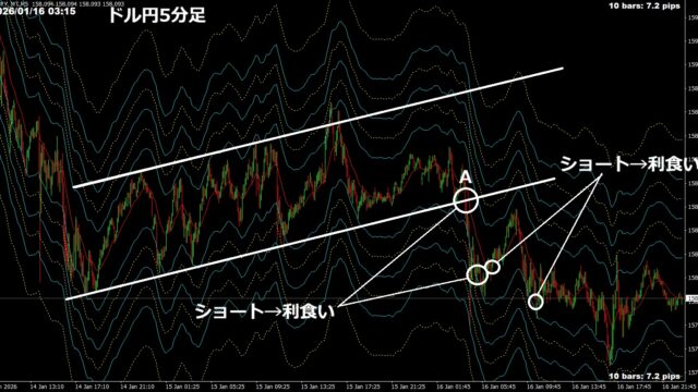 毎日収支 1/15(木)~1/16(金) +2.5万 2026年1月18日 ぶせな ドル円ショート目線。 木曜は下げを待つがダメ。1回トレードしたのみ。 金曜は、カウンターチャネルが引けたので下抜け待ち。下記Aでショートしたら、ヘッドラインが出たのか急落し …