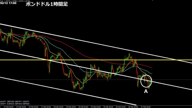 チャート分析 GBP/USD戻り売り|2つのラインの使い方 2026年2月27日 ぶせな 昨日は、ポンドドルをショートしました。戻り売りになったのでその根拠を見ておきます。 まず、1時間足で下記のようにチャネルラインが引けていたこと、そして日足が3連続陽線が出たの …