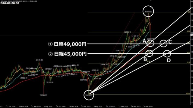 チャート分析 日経のリトレースメント+ファン 2026年3月9日 ぶせな 昨日の記事で、水平ラインと斜めのラインの2種類を引くことが大切と書きました。そのラインをフィボナッチ2つで引きました。 ①フィボナッチ・リトレースメント ②フィボナッチ …
