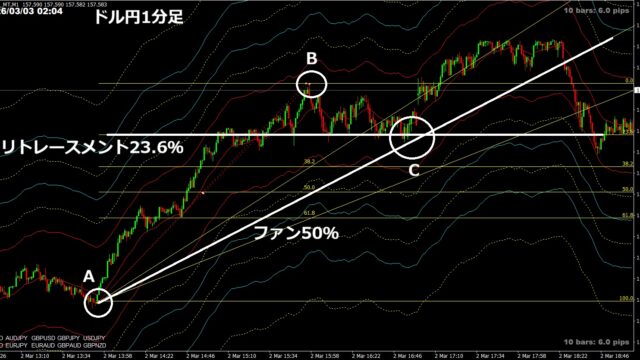 トレードスキル フィボナッチの組み合わせ|リトレースメント+ファン 2026年3月8日 ぶせな ライン分析は、水平ラインだけ、トレンドラインやチャネルラインのように斜めのラインだけでなく、横と斜めの2種類のラインを引くことが大切といつも …