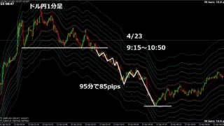 昨日はドル円が2回急騰し、数分で終わるのではなく、短期のトレンドが発生しました。1分足レベルの超短期トレンドは、ヘッドラインなどで突然出ることがあります。そういう時は、『30分ほど継続するのが基本』と捉えています。値幅とかテクニカルを考えず、時間的な基準です。