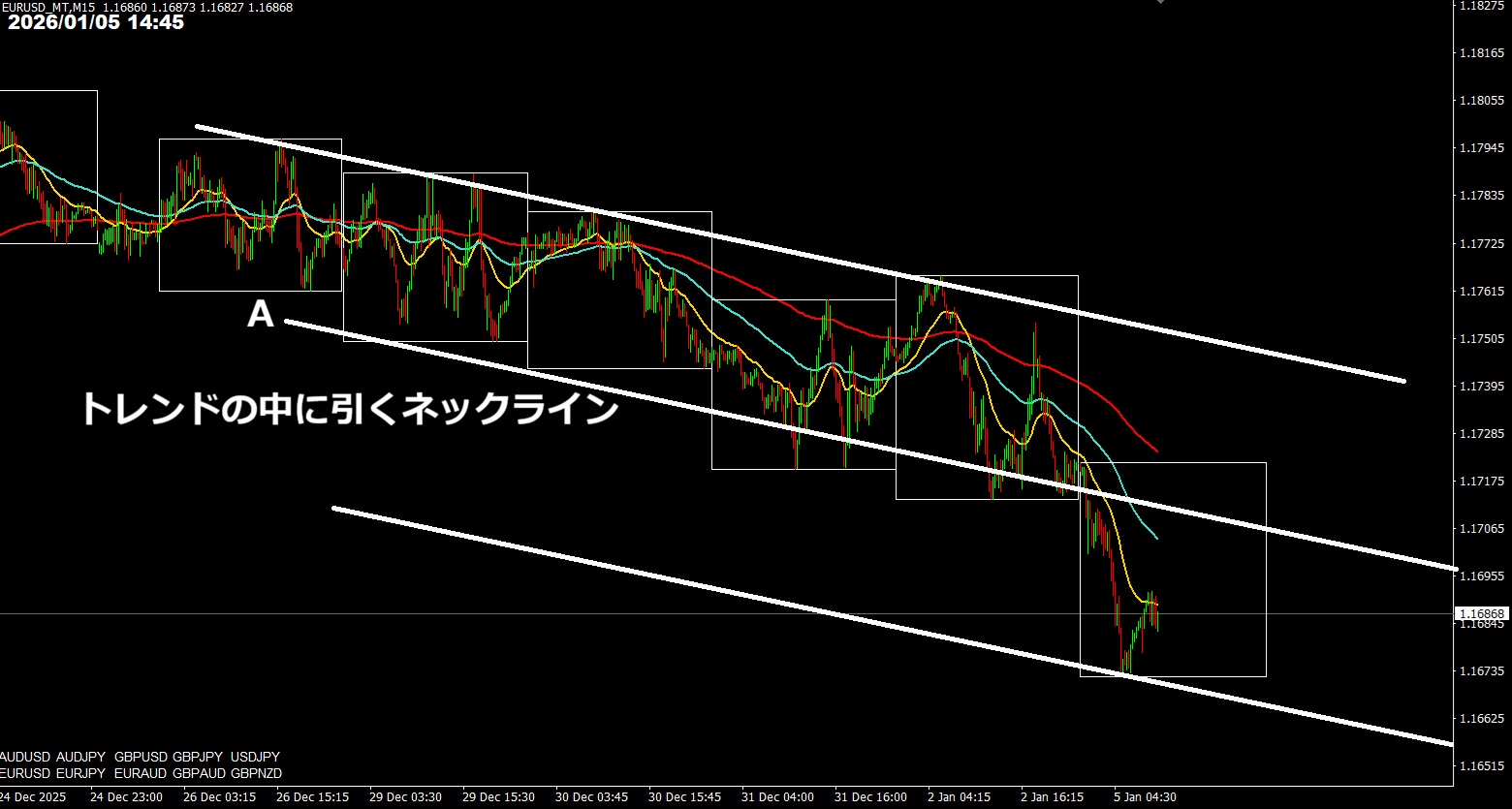 ポイントは、高値と安値の真ん中になるネックラインAです。これがあることで、トレンドの中心がすぐに認識できます。トレンドの中心からどれだけ離れているのか把握できますし、戻りのタイミングとしても使えます。ラインは、高値と安値だけに引くのではなく、真ん中にも引くようにしています。