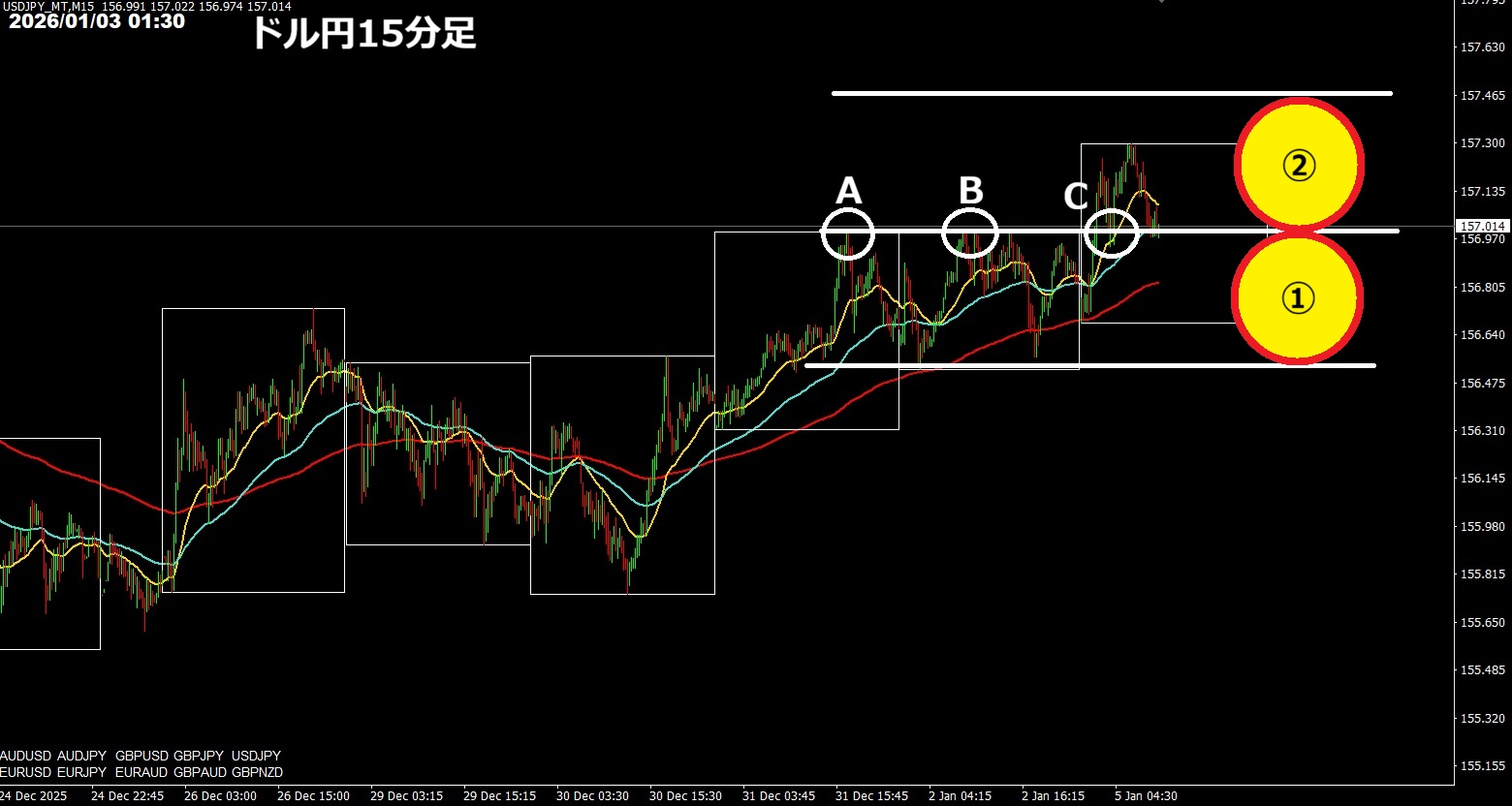 そして、利食いの目安があると、トレードはやりやすくなります。目安は値幅で取るのが一番楽なので、頻繁に使います。現在のドル円(16時頃)だと、下記になります。ABCで反応しているので、①が値幅の目安になり、かりに上昇トレンドが継続すれば②の値幅を達成するので、157.50円が利食いポイントです。