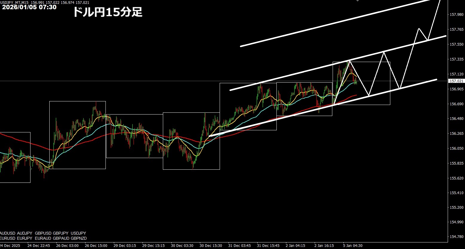 すぐに上がることを期待せず、上げ下げを繰り返しながら進むので、次のようなイメージです。もちろん上げ下げのリズムは当たるはずがなく、わかりません。ただ、安値を切り下げなければ、15分足レベルのトレンドは継続していると判断します。