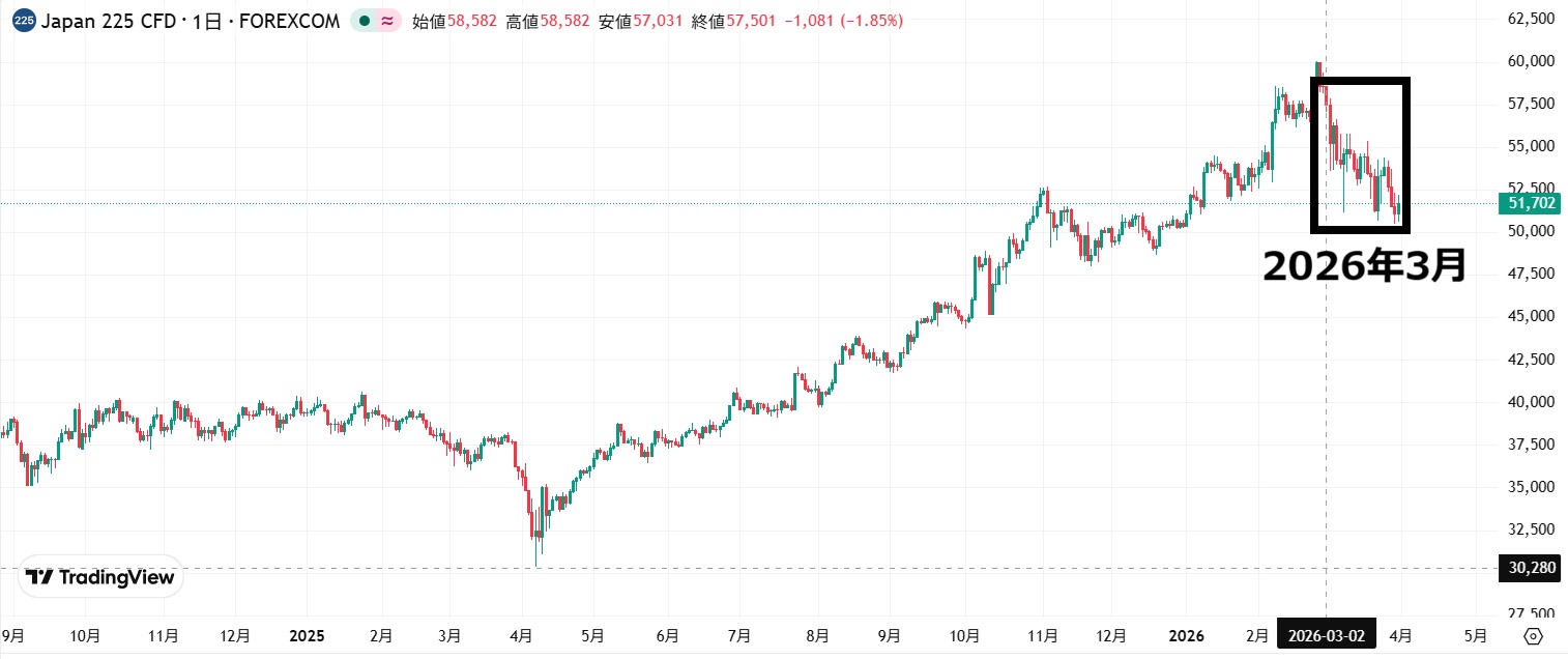 5万割れに備え、3/30にほとんどの持ち株は売ってしまった。たぶん、5万円割れずに終わるんだろうな・・・。そうなったら、先物の含み損が回復するし、株はまた買えばいいかなと考えている。