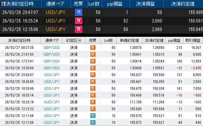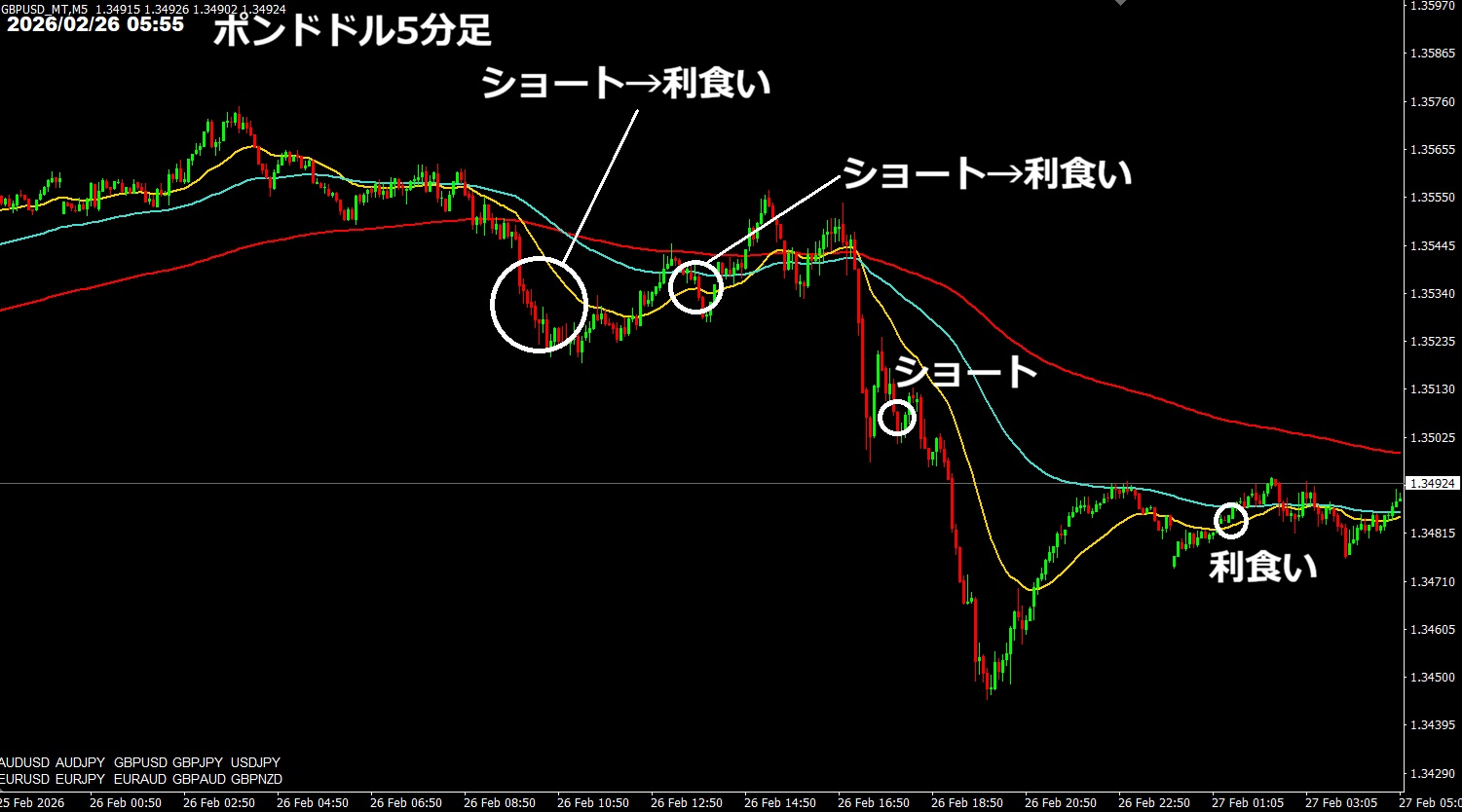 木曜はポンドドルが下目線。ロンドンからショート回転し、1回目は損切りでそれから3連勝(下記5分足チャート)と勝ち越して+3.4万。最初のショートは、深夜に+60pipsまで伸びてたが、指値入れてなくて朝利食い。