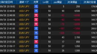 アジアから下がってきたので、ショートで入る。アジア後半に下げ渋ったので+25pipsで利食い。ロンドンから安値更新したのでここは入るべきだったか。
