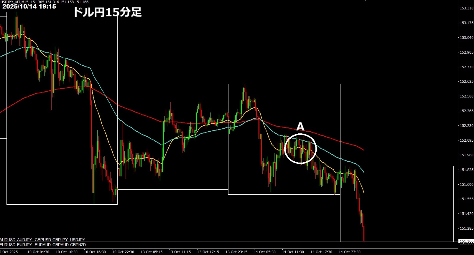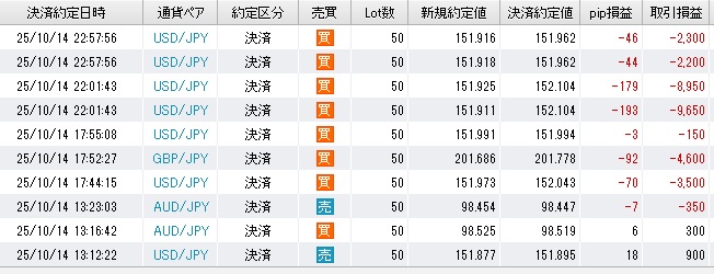 毎日収支 PR 10/13(月)~10/14(火) -3万 ぶせな 2025年10月15日 月曜はノートレ。 火曜はロンドンまでチャート見てオージー円で軽くスキャ。それから外出し、物件掃除してからカフェでちょいトレード。ニューヨークから再参戦。ドル円、クロス円が下目線で、ドル円を何回もショートするが、上下に振り回されて全部損切り(下記Aのポイントで)。デイトレードで5連敗とかやってしまった。 ドル円、ロンドンフィックスあたりから下げてるわ。 2025年10月 +16.3万