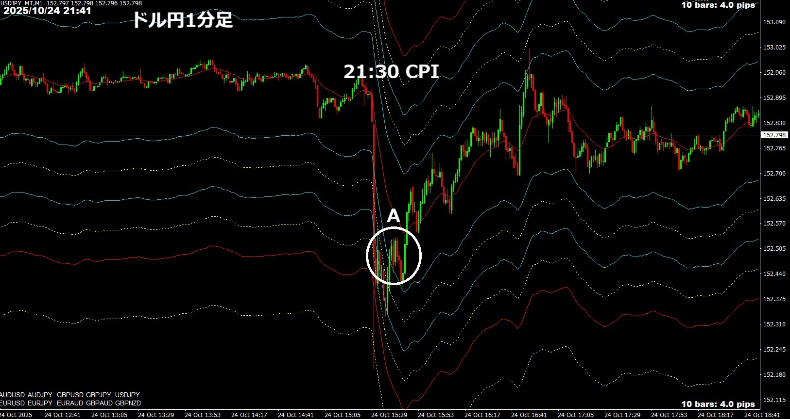 指標発表時、1本目の長い下ヒゲと2本目陽線で、なんだか下げそうもない。上目線だったのでロング中心に数回入った(下記チャートAの箇所)。移動平均線まで戻したところで、深追いせずに止めておいた。それからワンコの散歩とかで、ほとんどチャートは見なかった。
