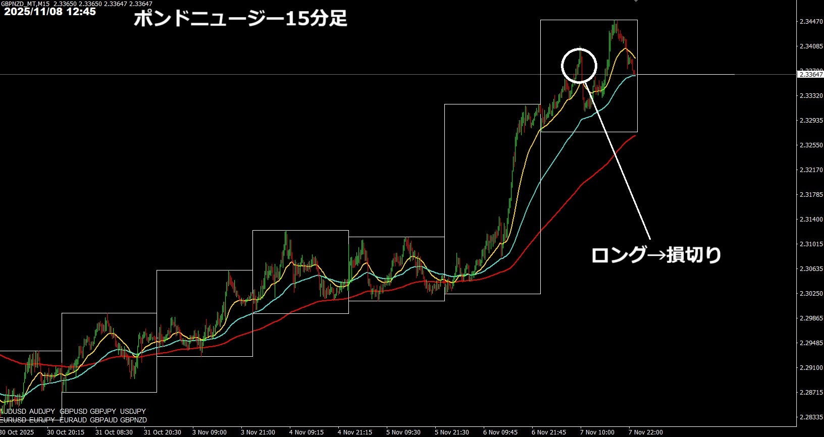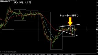 アジアは何があってもノートレのつもりだった。ロンドンから本格参戦し、トレンドフォローできそうなポンドニュージーを打診でロング(下記チャート)。直後に急落し、増し玉するのではなく損切りしてしまった。それから100pips以上も上げてるのを見ているだけ。。何のための打診だったのか。