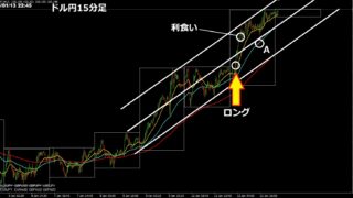 前日の味を占めてアジアからロング(下記チャートAの箇所)。すでに下抜けそうな箇所なのに、甘くなってるわ。案の定すぐに下げてきて、両建てでしのいだ。これが良かったのか、ニューヨーク初めの急落(Bの箇所)で、買いに回れたわ。