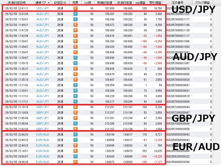 トレード履歴(下記)は、決済日時ではなく通貨ペアごとにしてみた。