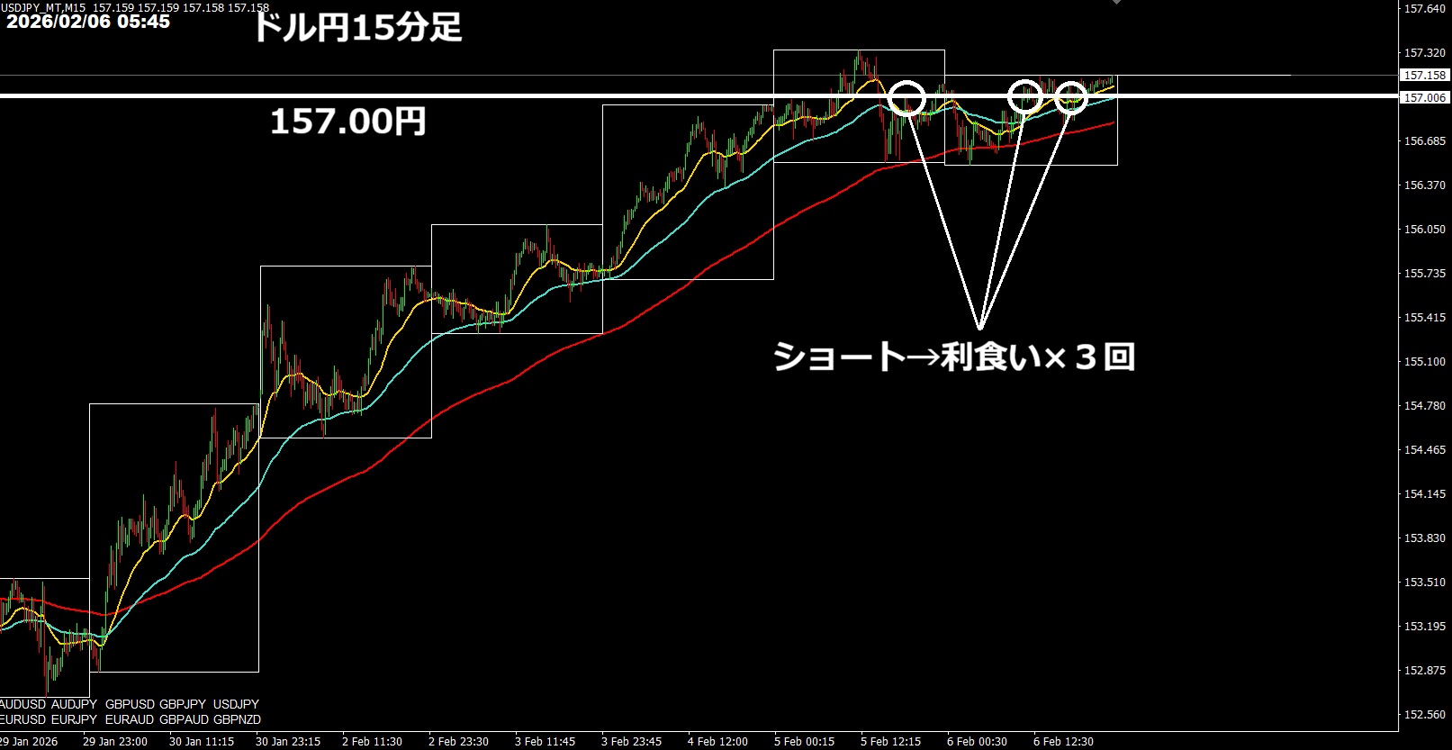 ドル円は157.00円で売り指値しててそれが3回。クローズにかけて高値つけてて、指値かかって持ち越し。チャート的には来週上にブレイクするか。