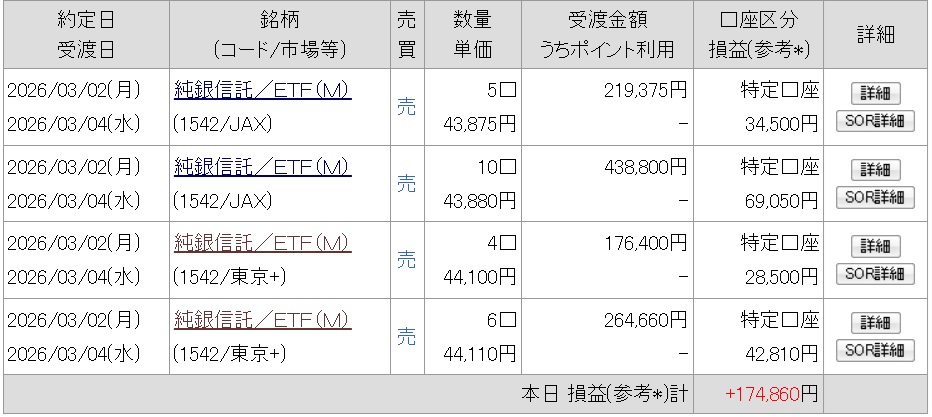 2/2に初めて買ったシルバーETFを利食い。ちょうど1か月でこれだけ取れれば悪くない。同じような勝ちは求めず、タイミングが良かっただけと考えておこう。商品のETFでトレードは想定外で面白かったわ。