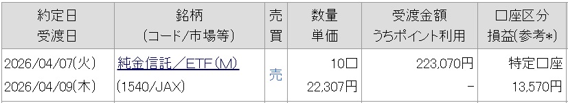 金ETFは、保有枚数が少ないのに長期戦になりそうなので利食いした。下がれば買い増ししたいが、下がりそうもないので脱落。残りは銀のETFがあり、もう少し保有。