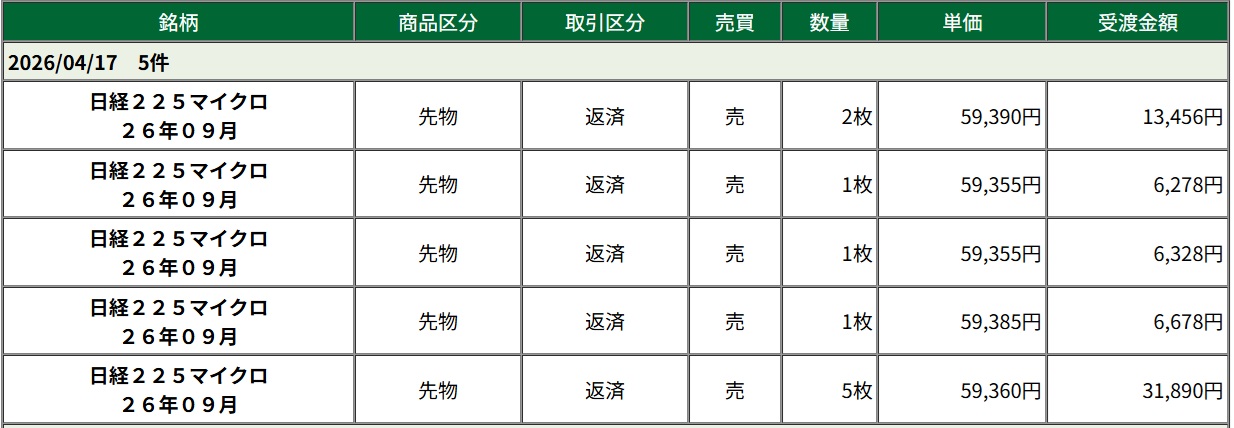 全てのポジションが利食いでき、ポジションはマイクロ10枚だけ。しばらく損益は少なくなりそうだ。日経のチャートはV字回復だが素直に喜べない・・