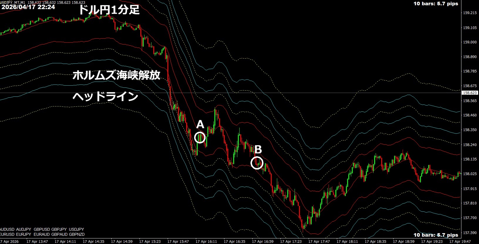 ポンド円のロングは、アジア初めにカット。ドル円をショートし、日中は物件掃除、買い物や車の点検。ニューヨークは、ヘッドラインでドル売りが入っていたがしばらく気付かず、Aでチャート見た(下記チャート)。ドル円を利食いし、Bまでスキャル。