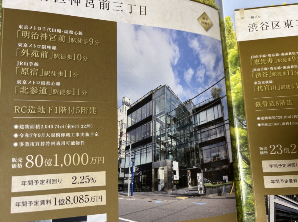 目玉物件は、渋谷区神宮前の一棟ビルで価格はなんと80億円です(下記写真)。