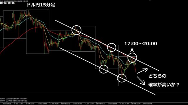 トレンドが発生するならおおよそこの角度で、という目星をつけておけば、数時間先のイメージができます。トレンドが発生するときは急角度になるので、今回だけでなく普通のトレンドでも活用できます。トレンドフォローは、①②③④のような急角度のチャネルラインになりますから、これにいかに乗るかという点を意識していれば無駄なポジションが減ると思います。