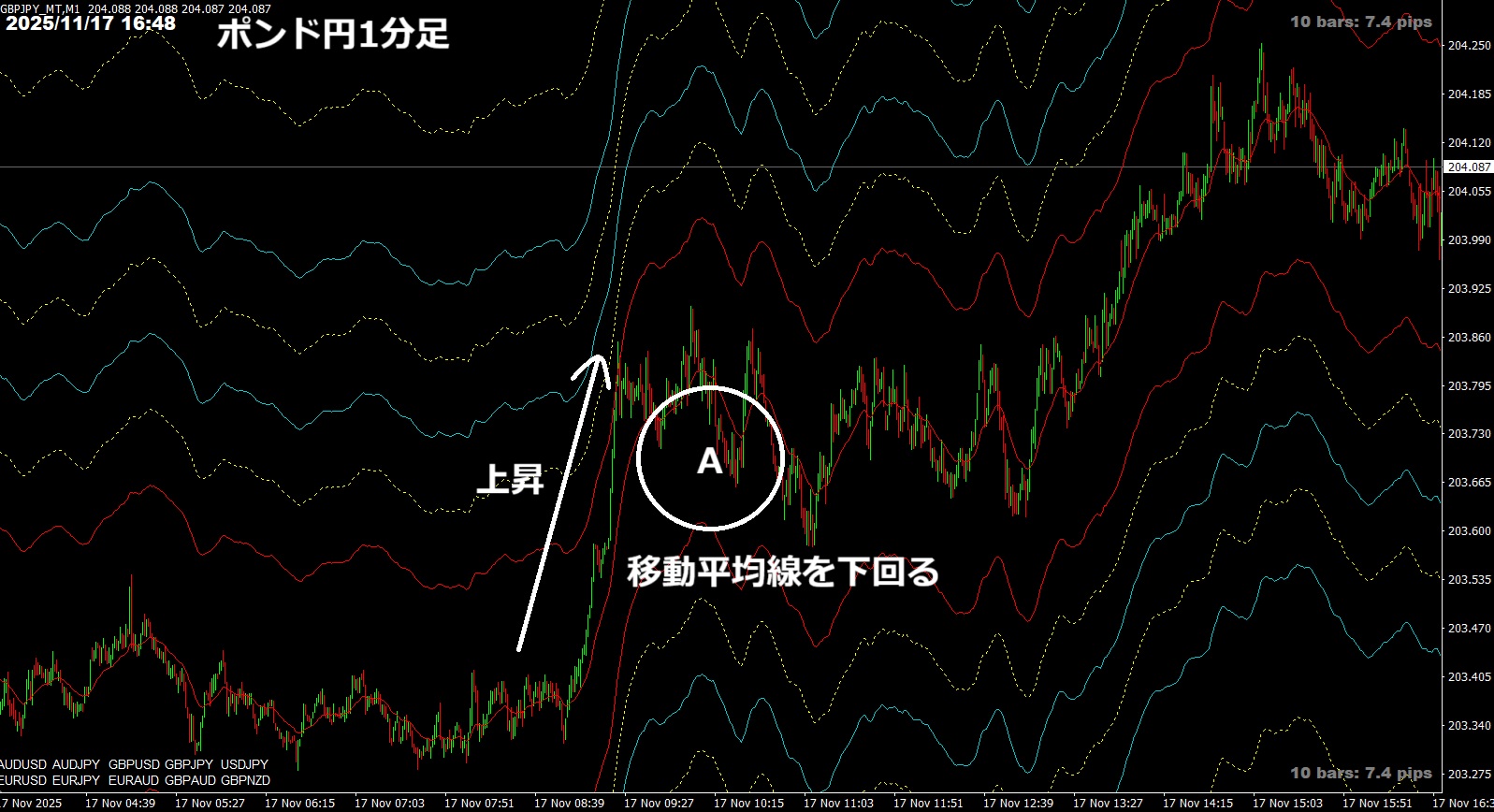 たとえば、順張りロングするなら、移動平均線より上にある場合のみロング回転します。下記チャートのAの箇所のように、上昇後の押し目で移動平均線を下回ったら、ひとまずロング目線は解消して様子見します。1分足の短期トレンドが継続するなら、移動平均線付近まで落ちたら買われますが、そうならないなら短期トレンドではないと判断できます。